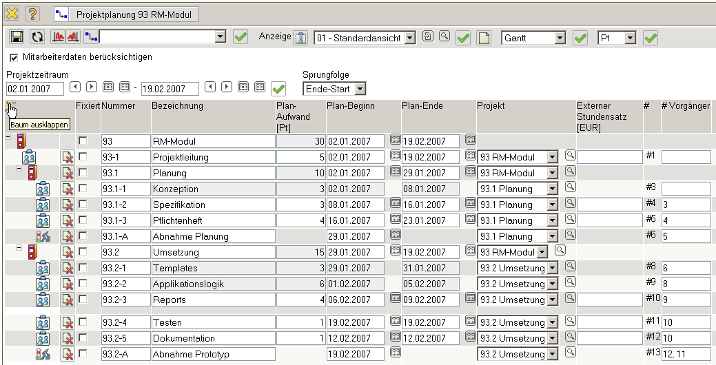 Im Beispiel ist ein Oberprojekt mit zwei Unterprojekten, mehreren Arbeitspaketen und Meilensteinen, sowie Ablaufbeziehungen zwischen den Aufgaben angelegt worden. Mit Hilfe der Funktion “Baum ausklappen” kann die gesamte Struktur eingesehen werden: