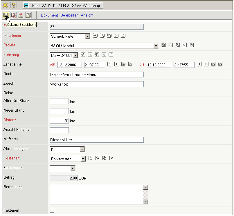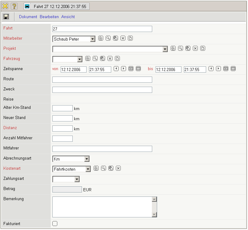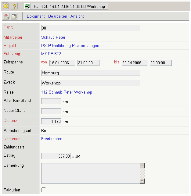 Das Dokument Fahrt ermöglicht die Erfassung von projektbezogenen Fahrten und deren Kosten, die der Projektmitarbeiter für das Projekt verursacht hat.