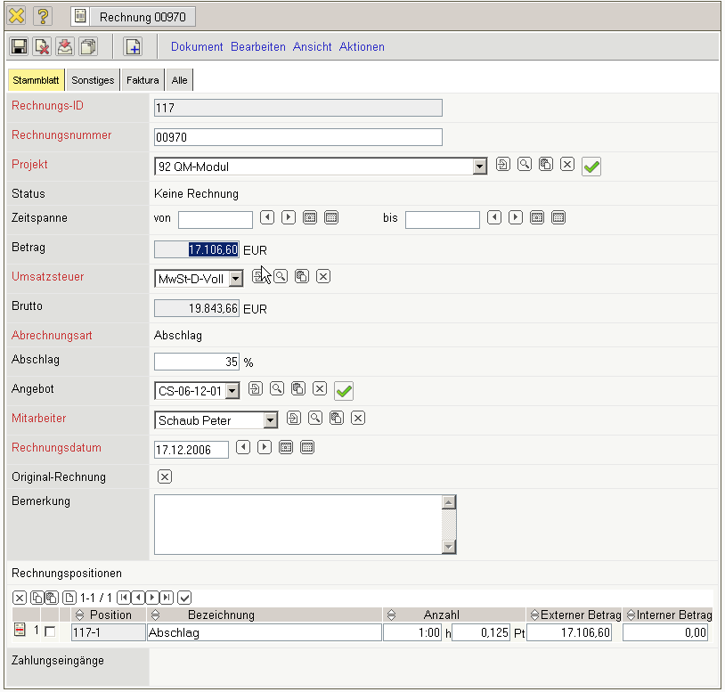 Bei der Abrechnungsart Abschlussrechnung erzeugt das System automatisch eine Rechnungsposition mit dem nicht abgerechneten Betrag des Budgets. Für diese Rechnung ist die Zuordnung zum Angebot gesetzt und eine Rechnung in Höhe von EUR 17.106,60 gestellt, also …
