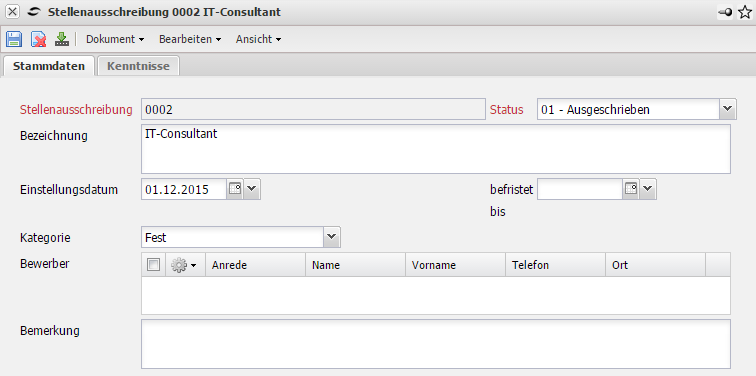 Nachdem die Grunddaten erfasst wurden und die Stellenausschreibung veröffentlicht wurde, können die einzelnen Bewerber über das Dokument Stellenausschreibung hin- zugefügt werden.