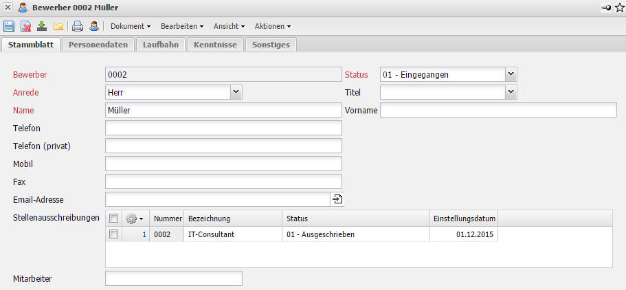 Auf dem Reiter Personendaten werden die persönlichen Adressdaten und Gehaltswün- sche beispielsweise erfasst, währenddessen man auf dem Reiter Laufbahn Dokumente zu Beruf oder der Schulausbildung hinzufügen kann. Abschließend können auf dem Reiter Kenntnisse die Fähigkeiten des Bewerbers erfasst werden und auf dem Reiter Sonstiges entsprechende Termine fixiert werden.