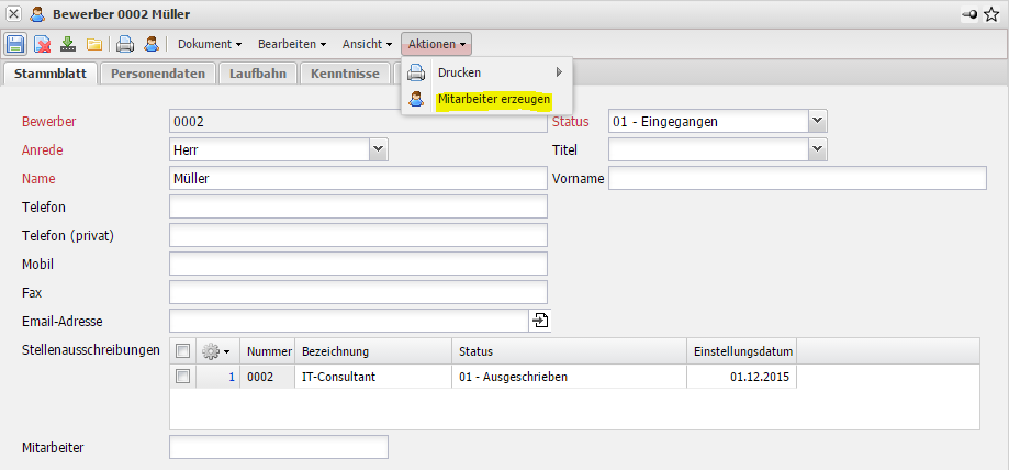 Im Dokument Bewerber werden die persönlichen Daten des Bewerbers inkl. Schulaus- bildung, beruflicher Laufbahn und Fähigkeiten erfasst und dokumentiert.