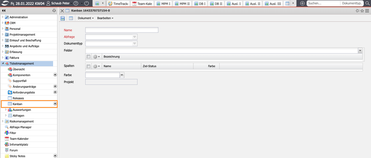 Die vorhandenen Kanban-Boards können Sie im Menüpunkt Ticketmanagement unter Kanban aufrufen und mit einem Klick auf das +-Zeichen auch ein neues Kanban-Board erstellen.