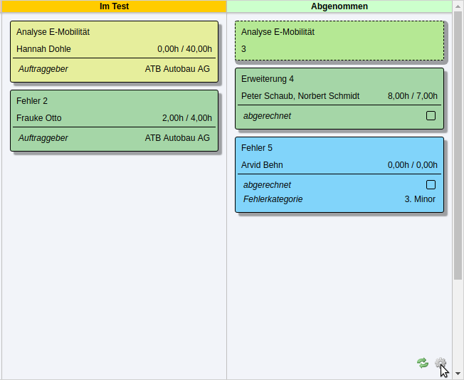 Über das Zahnrad unten rechts öffnet sich die Kanban-Konfiguration und über die grünen Pfeile links neben dem Zahnrad werden die angezeigten Dokumente neu geladen.