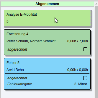 Hier sehen Sie, wie ein weiterer Task von der Spalte “im Test” in die Spalte “Abgenommen” gezogen wird. Da in dieser Spalte “Tasks gruppieren” aktiv ist…