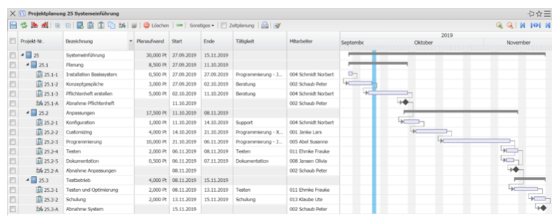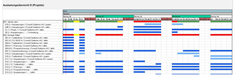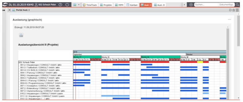 … aus den Parametern der Arbeitspakete Planaufwand, Planbeginn (Start) und Planende (Ende) die Auslastung der Mitarbeiter. Dabei werden ggf. Restauf- wandsschätzungen aus der Erfassung (TimeTracker) berücksichtigt.