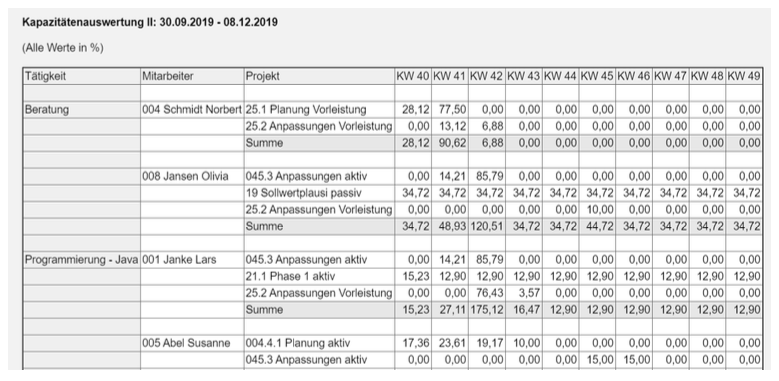 … und die Kapazitätsauswertung II. Diese Auswertung stellt für einen ausge- wählten Zeitraum die prozentuale oder absolute Auslastung der Mitarbeiter ta- bellarisch dar. Dabei können die Betrachtungsperioden von täglich bis jährlich ausgewählt werden.