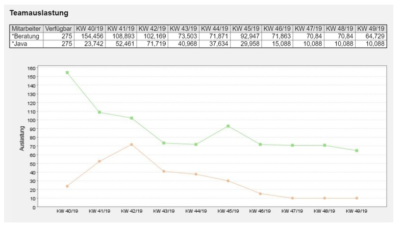 … ist auch die Auswertung „Teamauslastung“ interessant. Diese Auswertung stellt für die generischen Ressourcen inklusive der zugeordneten Mitarbeiter die Auslastung einer beliebigen Gruppe von Ressourcen dar: