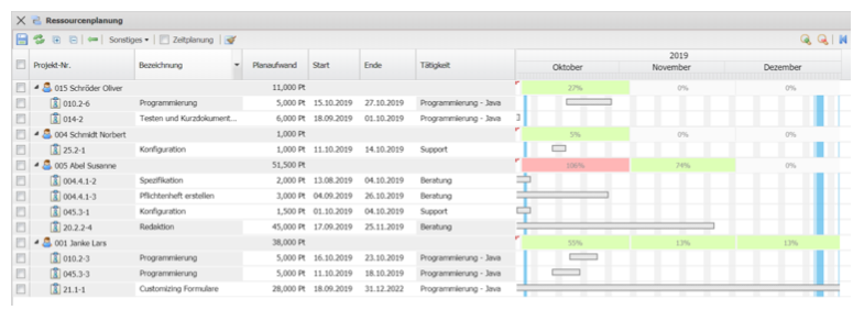 … öffnet sich die Ressourcenplanung für den ausgewählten Zeitraum und die Auslastung der Mitarbeiter wird angezeigt: