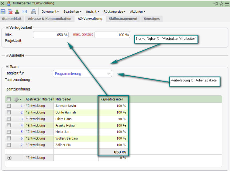 Für generische Mitarbeiter (Kategorie „Abstrakte Mitarbeiter“) können beliebig viele Mitarbeiter mit deren Anteil an diesem Team zugeordnet werden.