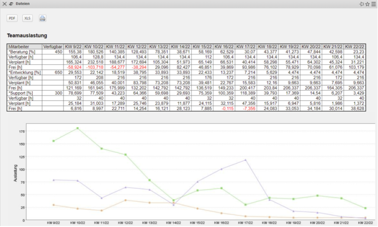Die Kapazitätenauswertung „Teamauslastung“ verrechnet dann die Teams mit den konkreten Mitarbeitern: