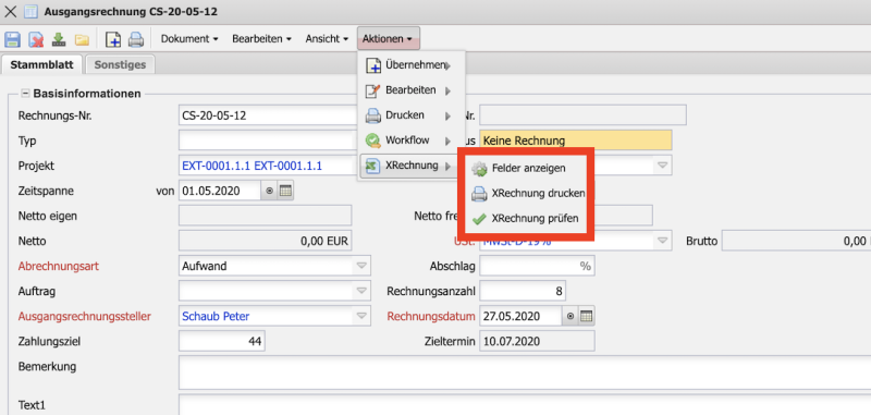• X-Rechnung prüfen: Prüft, ob alle für X-Rechnung benötigten Felder gefüllt sind und dem Standard entsprechenden Bedingungen genügen